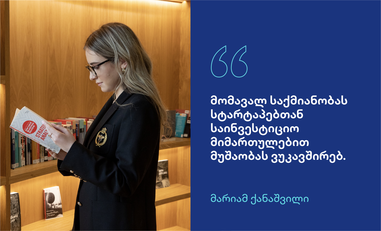 „ფინანსები ადრეული ასაკიდანვე მაინტერესებდა. კონკრეტულად საინვესტიციო სფეროთი კი, უნივერსიტეტში დავინტერესდი. ეს არის მიმართულება, რომელიც სწორი, სტრატეგიული გადაწყვეტილებების მიღებაში გვეხმარება. მე კი მომავალ საქმიანობას სტარტაპებთან საინვესტიციო მიმართულებით მუშაობას ვუკავშირებ”, - მარიამ ქანაშვილი.