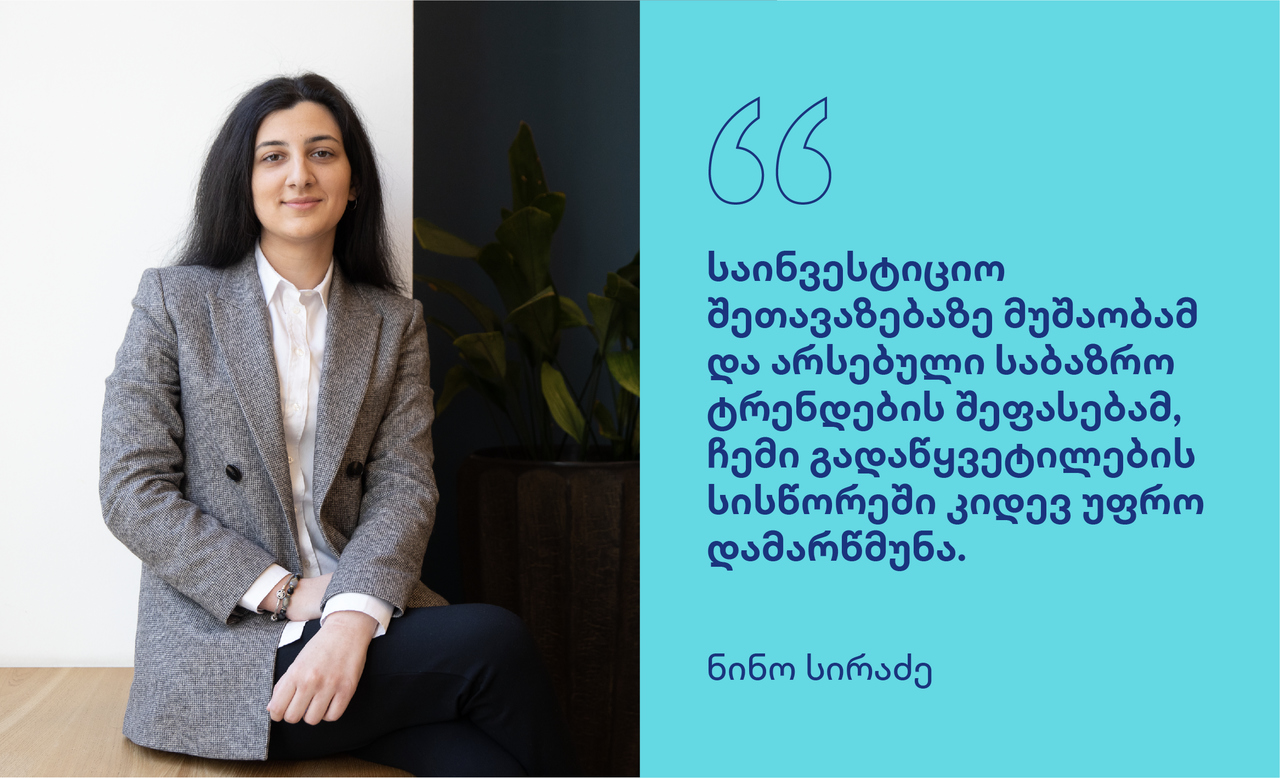 „თავდაპირევლად საინვესტიციო მიმართულებით ინტერესი სწავლის პროცესში გამიჩნდა. ახლა კი, „თიბისი კემპის“ ფარგლებში საინვესტიციო შეთავაზებაზე მუშაობამ და არსებული საბაზრო ტრენდების შეფასებამ, ჩემი გადაწყვეტილების სისწორეში კიდევ უფრო დამარწმუნა”, - ნინო სირაძე.