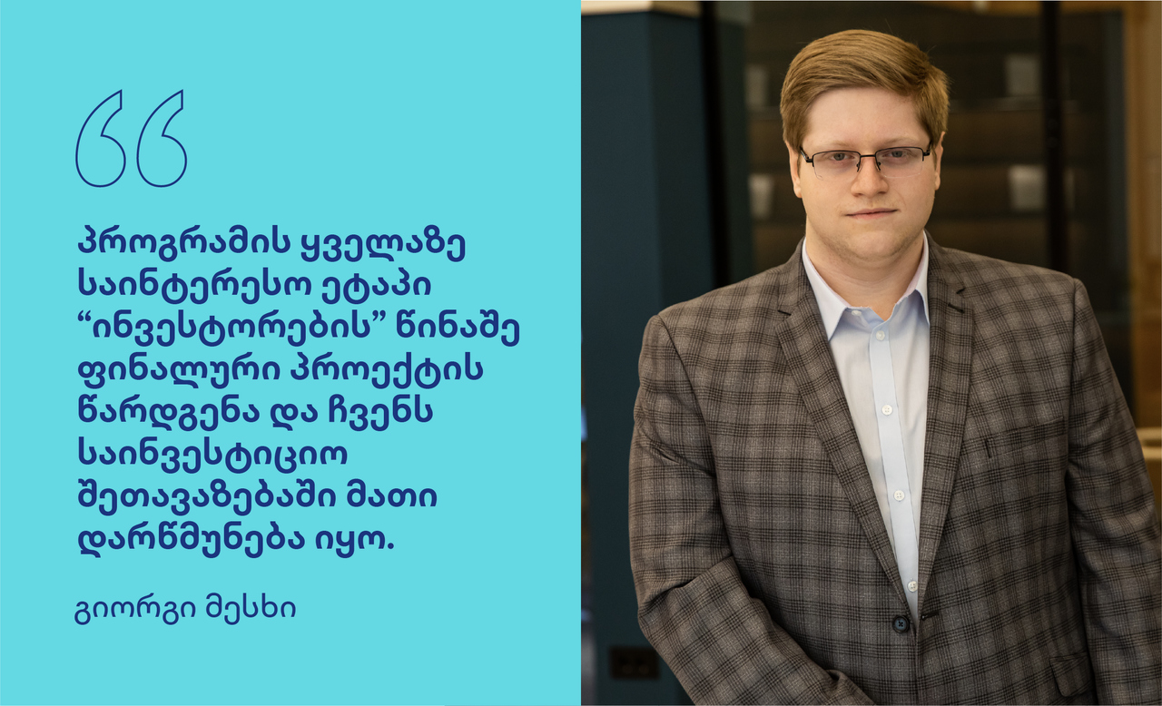 „საინვესტიციო სფეროში დამწყები სპეციალისტებისთვის ასეთი საინტერესო და სიღრმისეული პროგრამები იშვიათია. სწორედ ამიტომ, „თიბისი კემპის“ შესახებ როგორც კი გავიგე, ძალიან დავინტერესდი. პროგრამის ყველაზე საინტერესო ეტაპი “ინვესტორების” წინაშე ფინალური პროექტის წარდგენა და ჩვენს საინვესტიციო შეთავაზებაში მათი დარწმუნება იყო. ჩვენ მიერ შერჩეული კომპანიის ანალიზის შემდეგ, იმდენად გვჯეროდა წარდგენილი საინვესტიციო რეკომენდაციის, რომ “ინვესტორების” დარწმუნებაც არ გაგვიჭირდა”, - გიორგი მესხი.