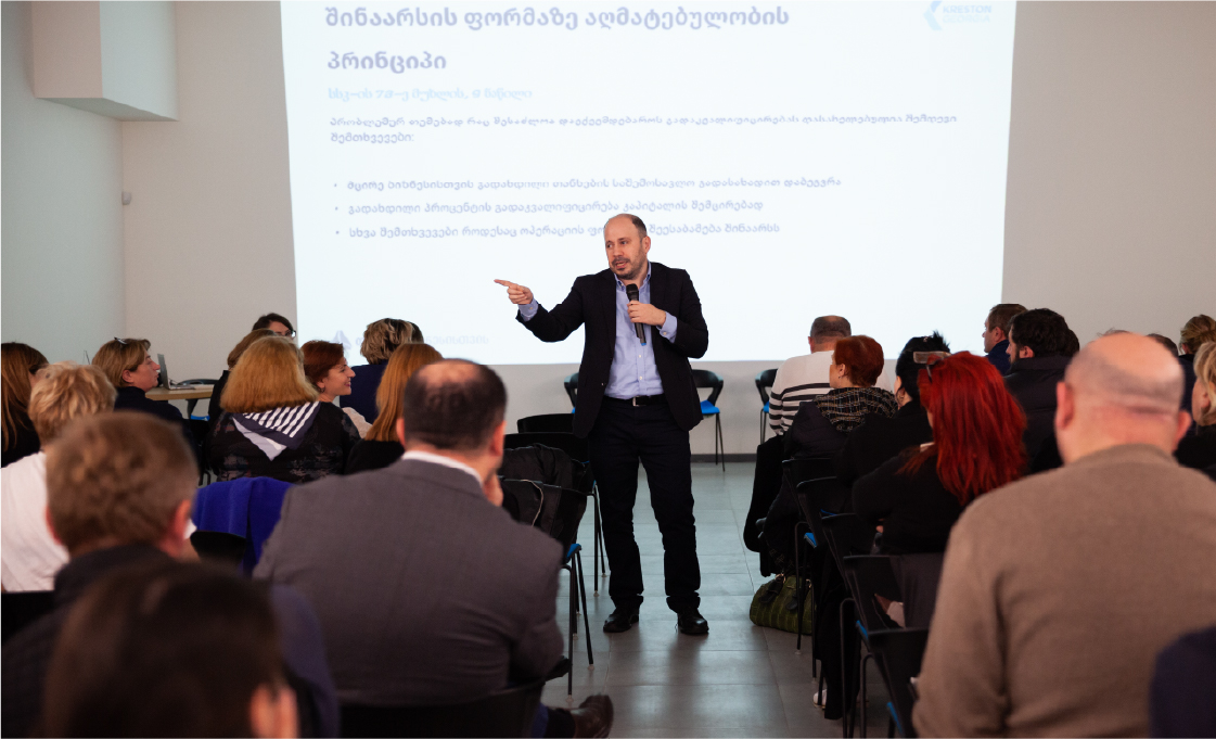 ტრენინგს, რომელიც საერთაშორისო ქსელური აუდიტორული კომპანია Kreston Georgia-ს მმართველმა პარტნიორმა დავით პაპიაშვილმა ჩაატარა, მცირე და საშუალო ბიზნესის 100-მდე წარმომადგენელი დაესწრო.