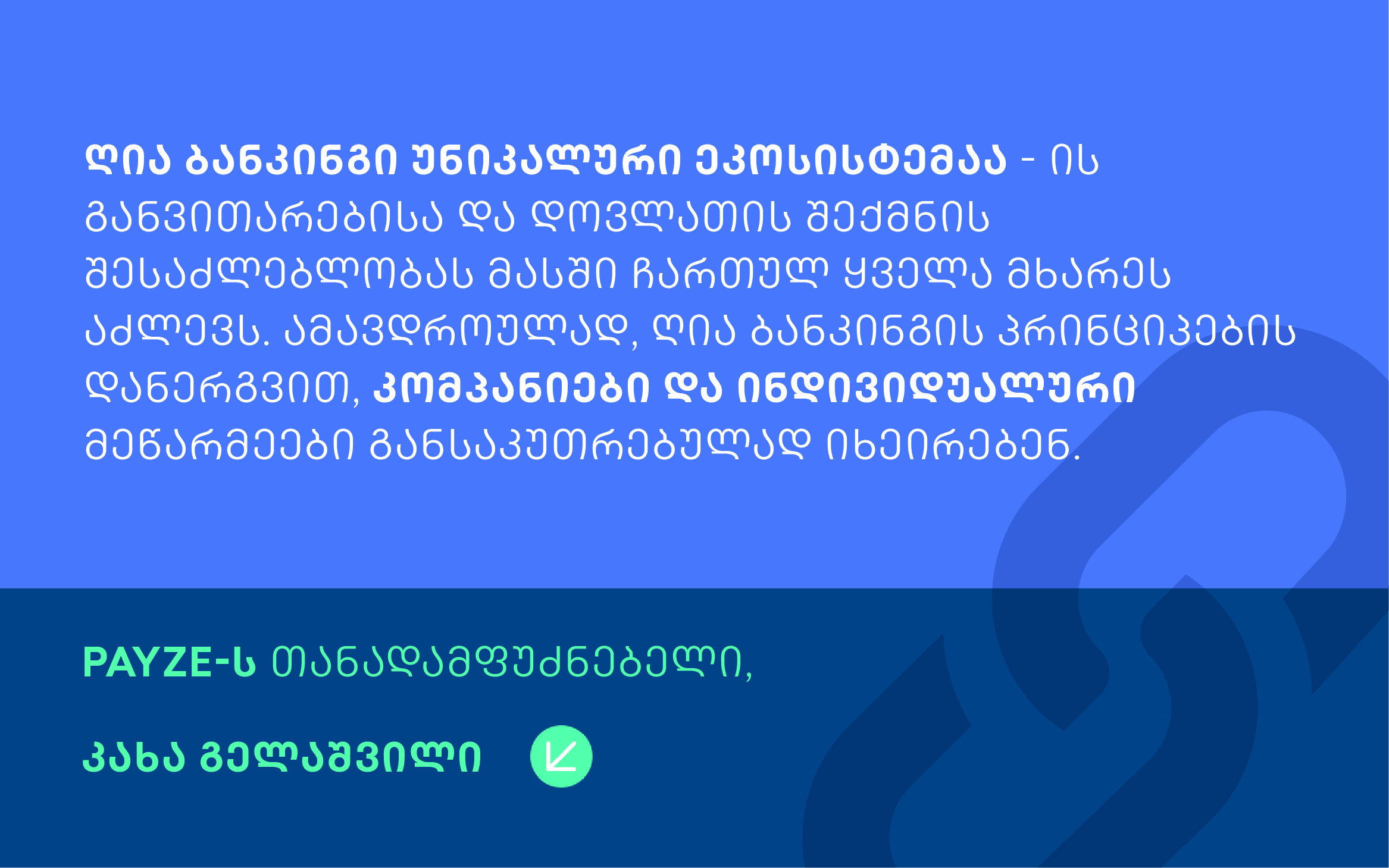 ღია ბანკინგი უნიკალური ეკოსისტემაა - ის განვითარებისა და დოვლათის შექმნის შესაძლებლობას მასში ჩართულ ყველა მხარეს აძლევს. ამავდროულად, ღია ბანკინგის პრინციპების დანერგვით, კომპანიები და ინდივიდუალური მეწარმეები განსაკუთრებულად იხეირებენ. ასე ფიქრობს ფინანსურ-ტექნოლოგიური სტარტაპის, Payze-ს თანადამფუძნებელი, კახა გელაშვილი: „ქართულ ბაზარზე არსებული ფინანსურ-ტექნოლოგიური კომპანიებისთვის, ღია ბანკინგის ფუნქციონალის დანერგვა - ძალიან მნიშველოვანი მოვლენა იქნება. ფაქტია, რომ ნებისმიერი ფინტექ პროდუქტის სათავესთან ბანკები და საბანკო სერვისების მომწოდებლები დგანან, მაგრამ დღემდე, ჩვენს სისტემებში მათი პროდუქტების გამოყენება დიდ ძალისხმევას მოითხოვს, რადგან ინტერნეტბანკის მესამე პირებისთვის ხელმისაწვდომობის პროტოკოლები ყველა ბანკს არ აქვს. ღია ბანკინგის ეკოსისტემის გააქტიურების მერე კი, ფინანსურ ტექნოლოგიებში საბანკო პროდუქტების ინტეგრაცია გამარტივდება, რაც ჩვენც და საგადასახადო სერვისის ყველა სხვა მომწოდებელს ახალი და საინტერესო პროდუქტების შექმნის საშუალებას მოგვცემს - მარტივად რომ ვთქვათ, გადახდების ავტომატიზაცია განვითარების ახალ ეტაპზე გადავა“.