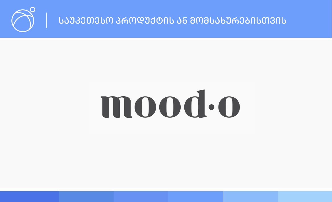 Moodo არის კომპანია, რომელიც აწარმოებს ფუნქციონალურ სახლის ნივთებს, შთაგონებულს ქართული ისტორიითა და დავიწყებული პატერნებით, თუმცა თანამედროვე ხედვით და ყოველდღიურობაში მოხმარების იდეალური გადატანით. საქართველოს ბაზარზე არ არის საშუალო+ სეგმენტის, კონცეპტუალური, მრავალპროფიური სახლის აქსესუარების ქართული მწარმოებელი კომპანია/მაღაზია. მთელს მსოფლიოში ძალიან აქტუალური ხდება პატარა ადგილობრივი საწარმოები, რომლებიც სთავაზობენ ბაზარს არა მასიურ, ერთნაირ პროდუქციას, არამედ უნიკალურ, ხელნაკეთ და ავთენტურ ნივთებს, რომელიც ასახავს გამორჩეულ კონცეფციას, იმ ქვეყნისთვის დამახასიათებელ კომფორტს და ტრადიციებს, გამოშვებულია ლიმიტირებული რაოდენობით. Moodo აწარმოებს სუფრებს, ხელსახოცებს, ბალიშებსა და მუთაქებს, პიკნიკის ხალიჩებს. სუფრის პატერნები შთაგონებულია ვახუშტი ბაგრატიონის გეოგრაფიული ატლასის გერბებით. სამომავლოდ დაგეგმილი, ასორტიმენტის გაზრდა, საკუთარი მაღაზიის გახსნა და საერთაშორისო ბაზარზე გასვლა, რაც ასევე გულისხმობს საკუთარი მცირე საწარმოს აწყობასაც.