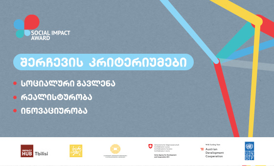 Social Impact Award 2021 ხორციელდება თიბისის პროგრამა სტარტაპერის, გაეროს განვითარების პროგრამის (UNDP), საქართველოს რეგიონული განვითარებისა და ინფრასტრუქტურის სამინისტროს, შვეიცარიის განვითარებისა და თანამშრომლობის სააგენტოსა (SDC) და ავსტრიის განვითარების თანამშრომლობის (ADC) მხარდაჭერით.